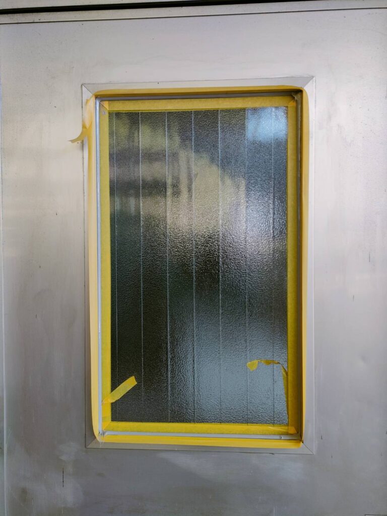 〇中スリガラスは、中央だけを曇らせた半透明タイプで、ガラス縁は透明のままです。工場で中心部を丁寧にサンドブラスト加工するため、納期は取り付け前から約3〜4週間かかります!