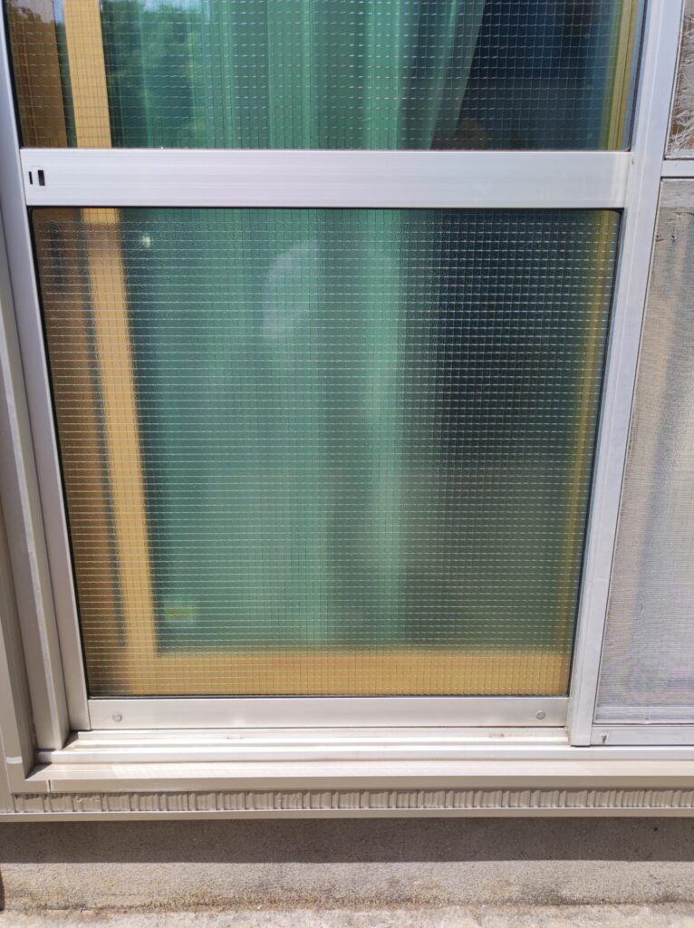 〇網入りガラスは、マンションや防火、準防火地域の建物で使用されています。万が一の火事の際にもガラスが崩れ落ちることなく原型を留めることで、炎の延焼を防ぐ役割がある防火ガラスです。