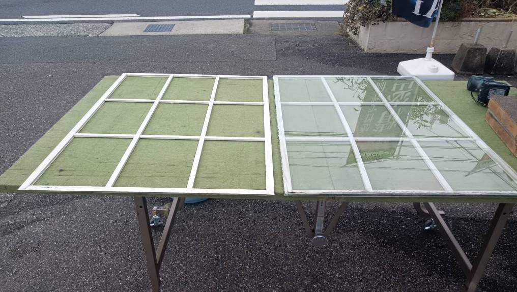ガラス撤去後、可能な範囲でカビを除去し、縁まわりを清掃しておきます。装飾格子窓は、こうした下処理をしておくと仕上がりがきれいになります。
