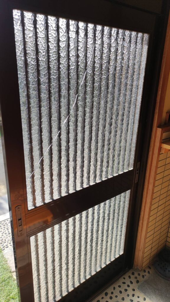 現在は廃盤になっている昭和型板ガラスの石目柄が割れていたため、現行の霞柄を代用しガラス交換となりました。
